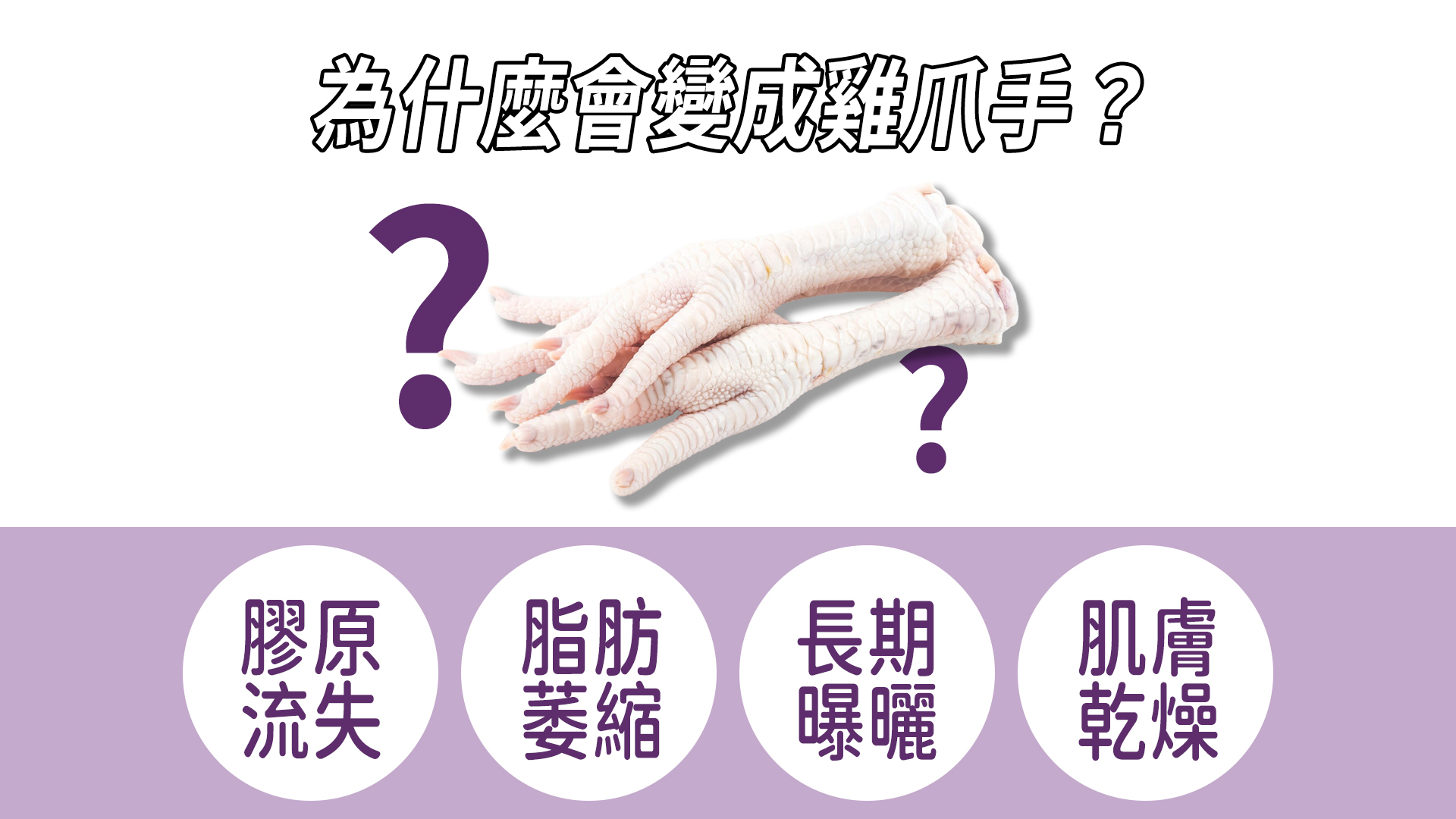 手部皮膚天生薄、皮下脂肪少,隨著歲月流逝,膠原蛋白與脂肪漸漸流失,靜脈與筋膜便會浮現,讓手背看起來乾枯凹陷,也就是俗稱的「雞爪手」。難怪有人說:「臉能騙人,手卻藏不住歲月。」