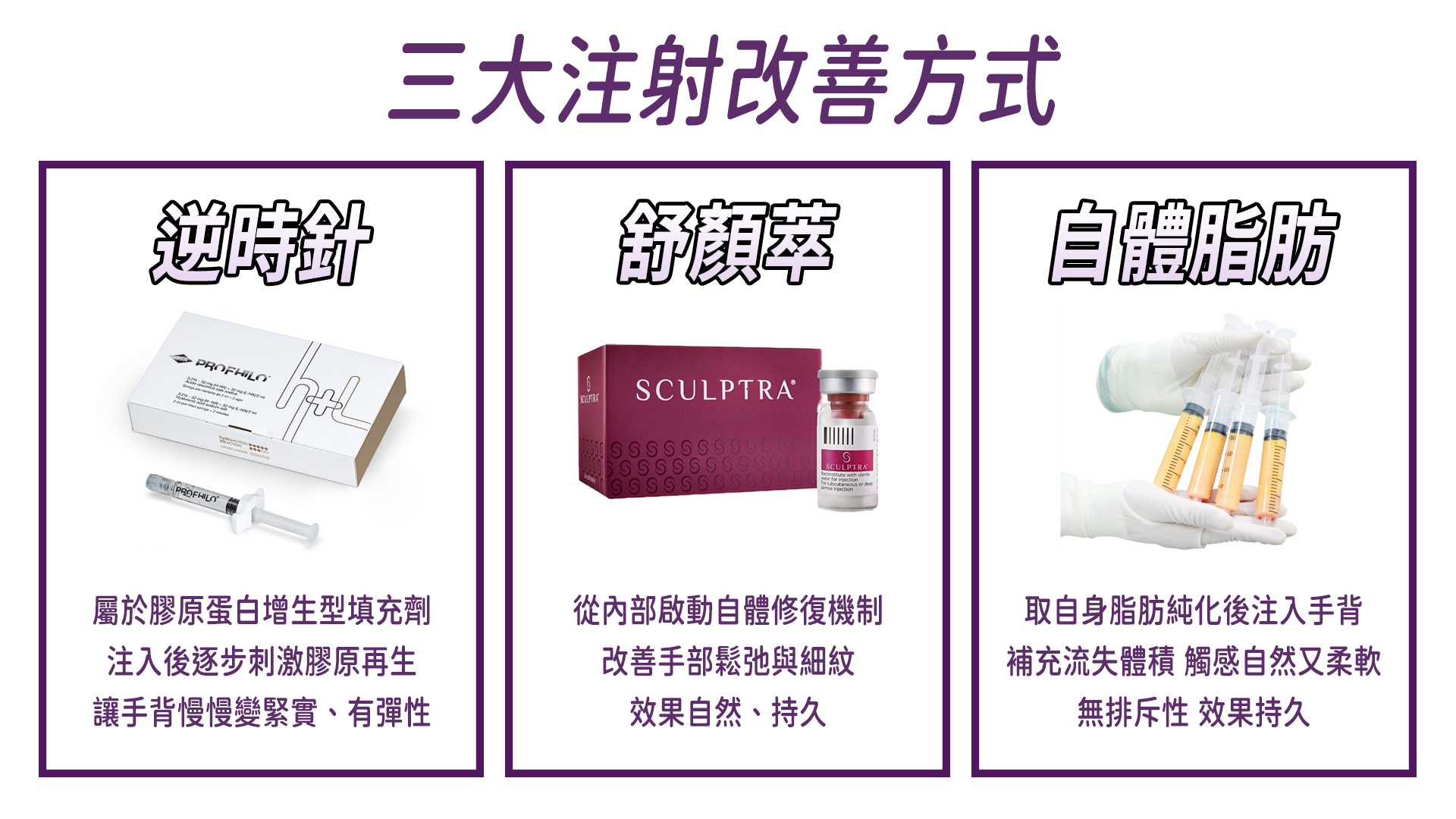 透過注射逆時針玻尿酸、聚左旋乳酸(Sculptra)或自體脂肪,即可填補流失的體積、促進膠原新生,讓手部恢復光滑柔嫩。