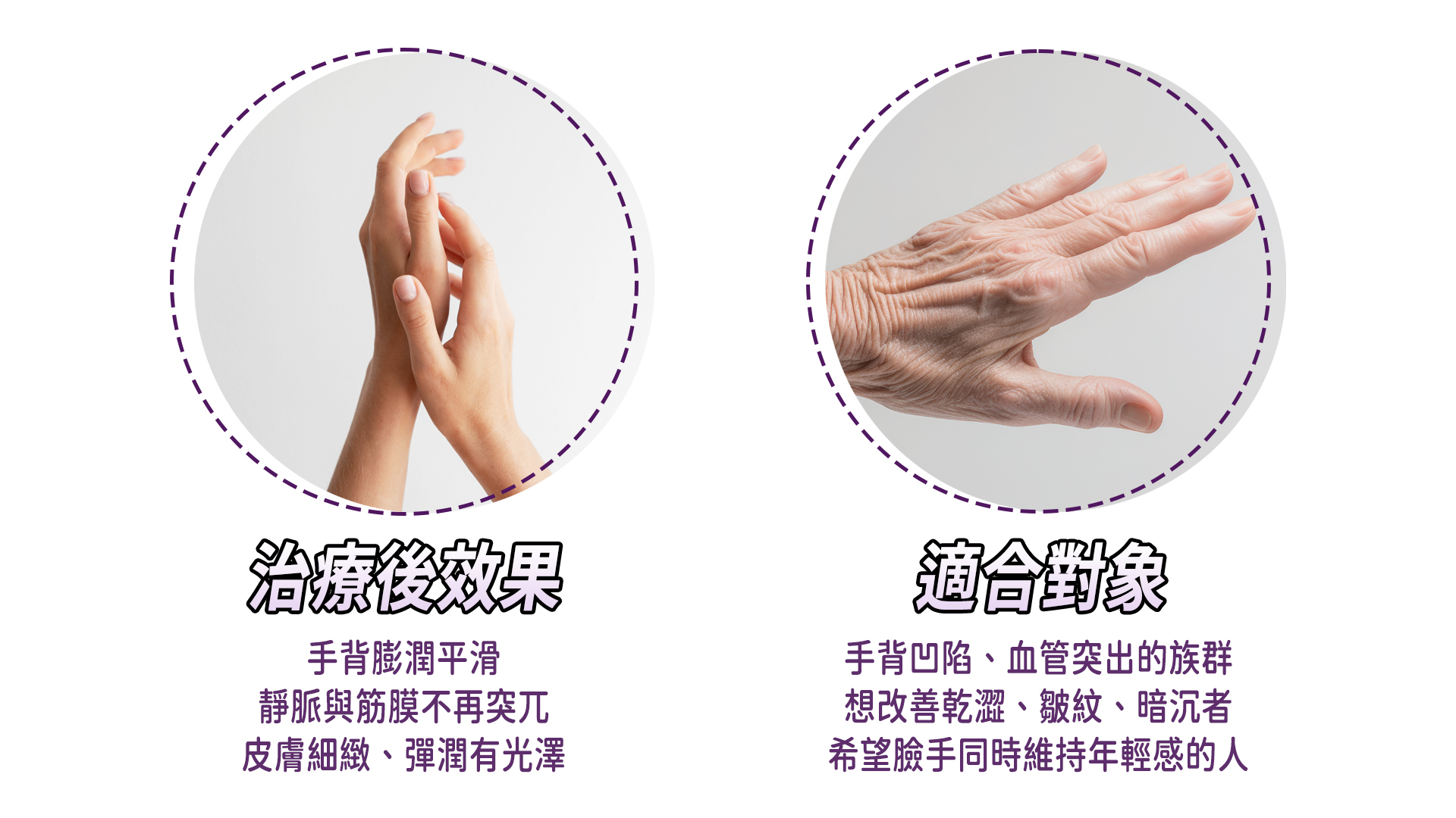 取自身脂肪(如大腿、腹部)純化後注入手背,補充流失體積,觸感自然又柔軟。
