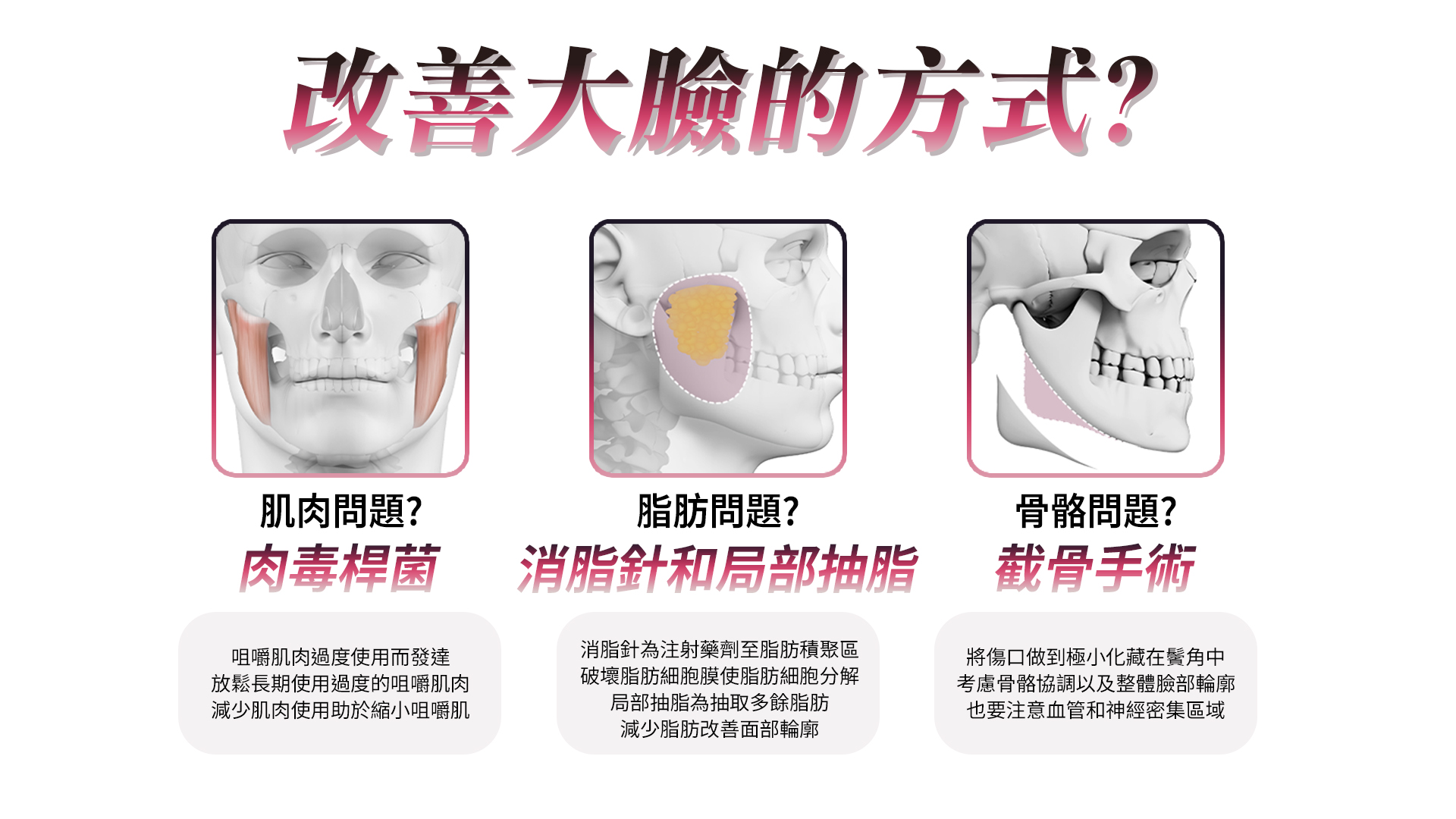 肌肉型大臉是由於咀嚼肌肉過度使用而導致發達,建議可以考慮使用肉毒桿菌,通常被稱為瘦臉針或小臉針,來放鬆長期使用過度的咀嚼肌肉,肉毒桿菌可以阻斷神經末梢釋放乙醯膽鹼等依賴性神經傳導物質的鈣離子,使肌肉在放鬆後無法過度用力和使用,因此減少肌肉的使用將有助於逐漸縮小肥大的肌肉,達到瘦小臉的效果!
