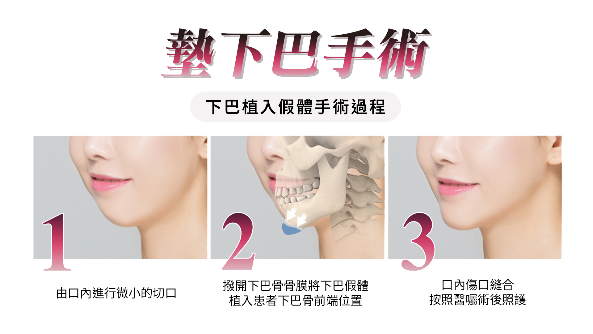 若需要稍微延長下巴或增加體積,通常會使用矽膠、卡麥拉或鈦氪斯等材料,目前最新的選擇是100%純Gore-Tex鈦氪斯,這種材料不易產生莢膜、移位或骨頭凹陷。在必要時,醫師可能會在下巴正下方使用縫外固定線,約五到七天後才會拆除線。