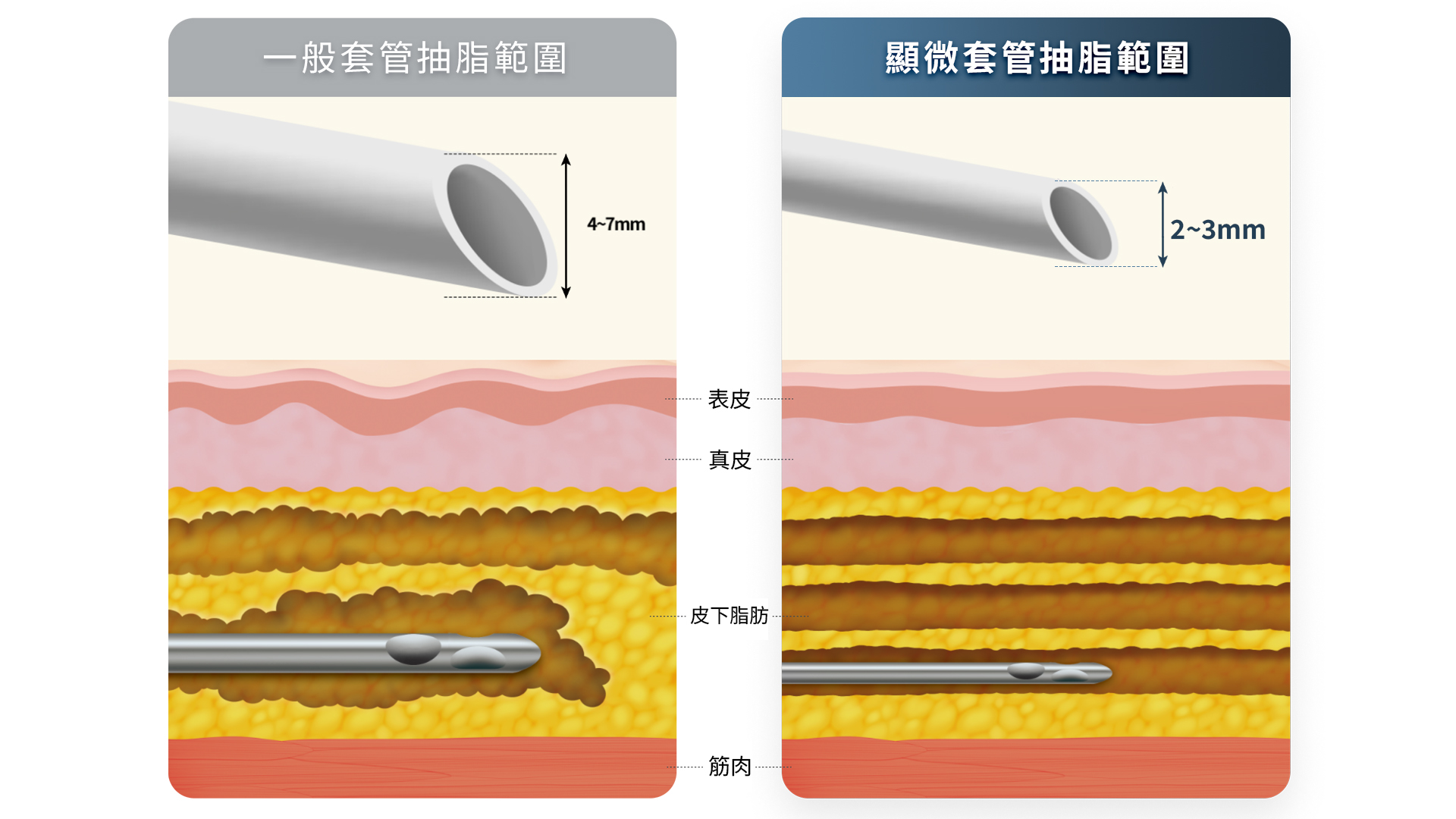 但真正的顯微套管抽脂重點不是用小管徑抽脂,最重要的是很精確的腫脹麻醉技術以及抽脂的技巧。