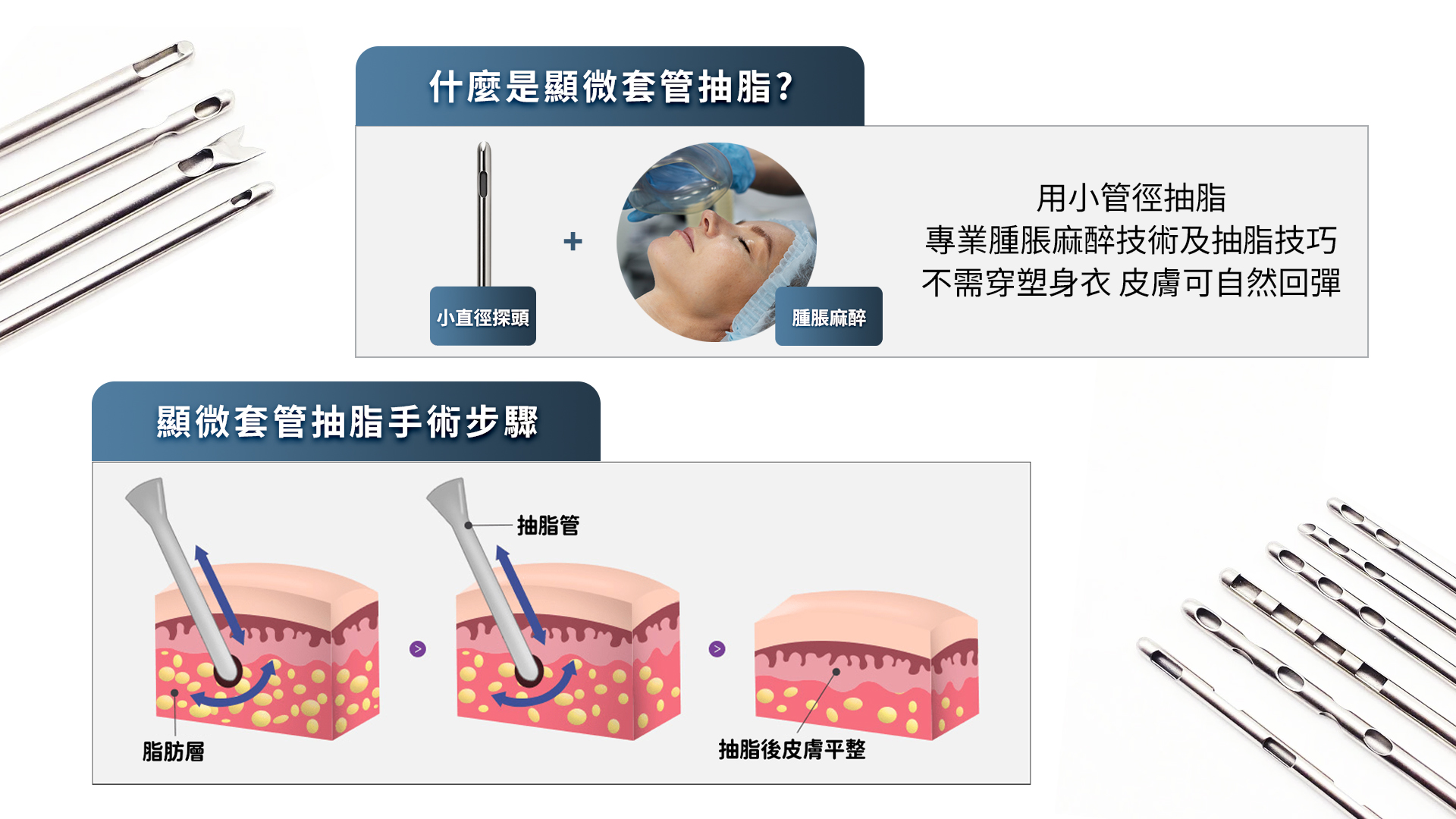 顯微套管抽脂技術在國外已經流行多年,被廣泛認可為安全且有效的抽脂方法,逐漸成為主流。採先進而少副作用的腫脹麻醉術來取代傳統的全身麻醉,並搭配微型抽脂套管來進行抽脂
