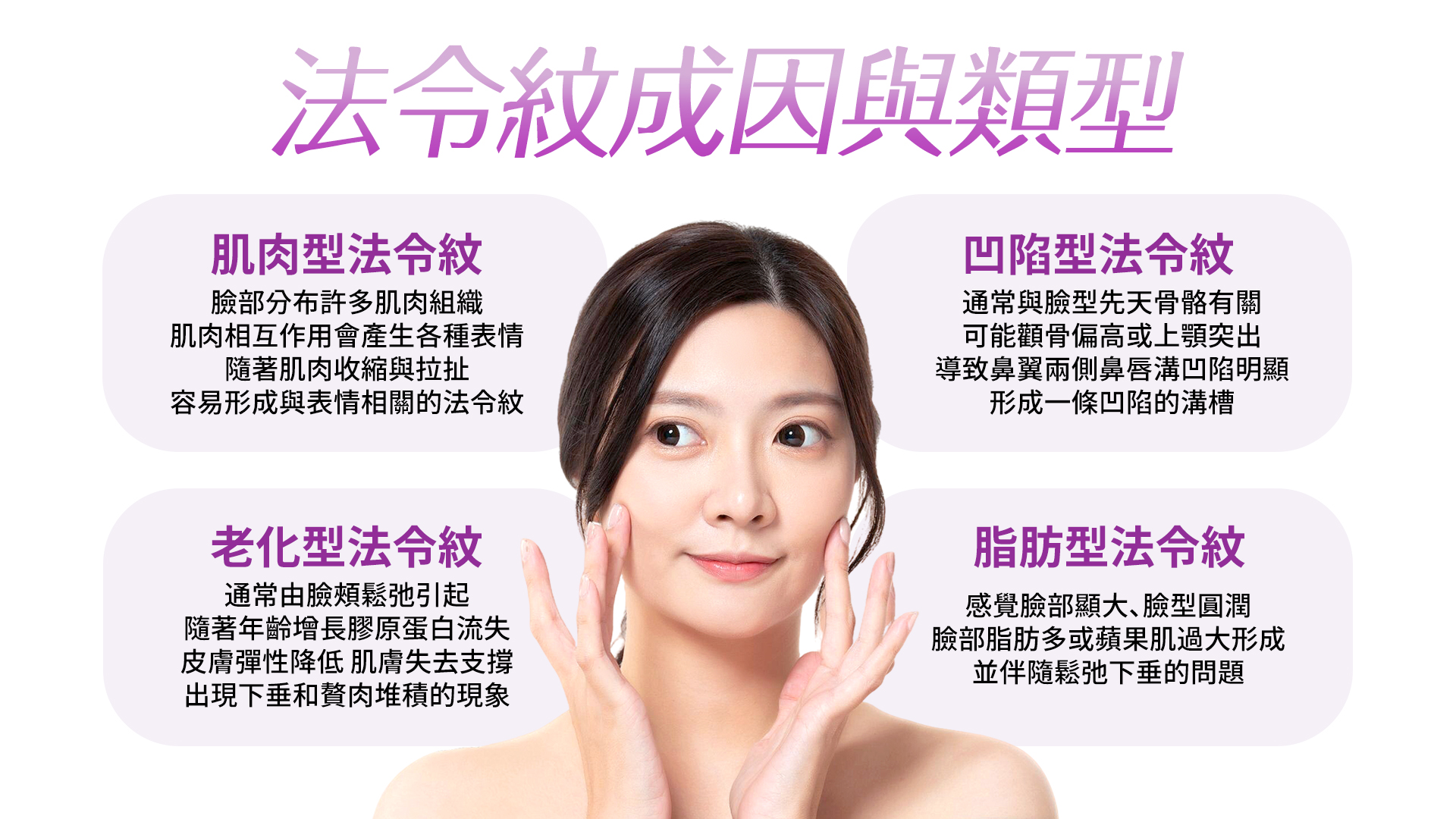法令紋分為多種型態,不同型態的法令紋,治療方式與呈現的效果都不一樣。臉上一旦出現紋路就顯得老態,特別是中臉凹陷視覺讓人鬆弛下垂現象。