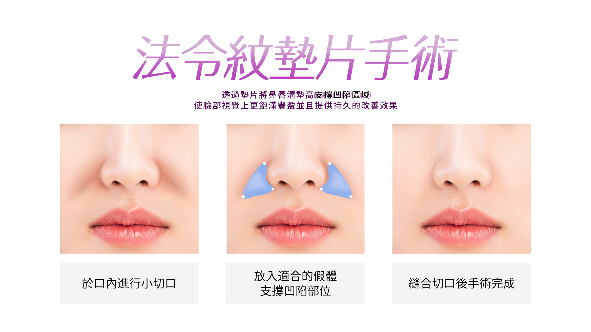 法令紋墊片手術,又稱為法令紋貴族手術,主要是在口內或鼻孔內開一個約1~1.5公分的傷口,再將特製假體例如Goretex、Medpore(人工骨)依患者皮膚凹陷程度量身訂製成小小的三角形植入,透過法令紋貴族手術可有效拉提鼻唇溝,植入後無異物感,通過植入物的有利支撐,能提升中臉的飽滿度,不同深淺層的法令紋皆可有效隱藏修飾,維持時間更為長久。