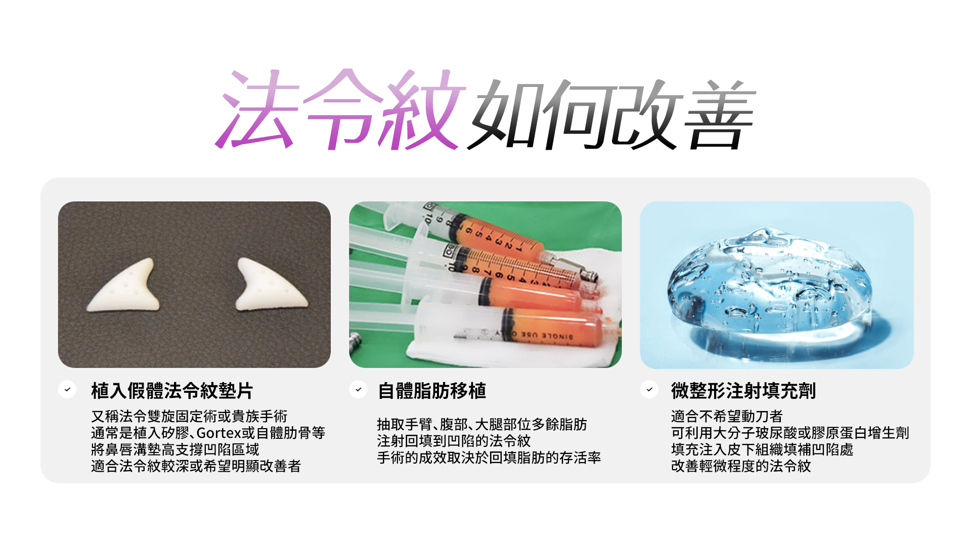透過抽取手臂、腹部、大腿等部位的多餘脂肪,注射回填到凹陷的法令紋,同時還能雕塑其他部位的身形,達到一舉兩得的效果。不過,這項手術的成效取決於回填脂肪的存活率,如果脂肪能順利存活,將可長久保留在臉上;但若存活率不佳,可能會導致臉部出現脂肪鈣化的硬塊,後續可能需要透過手術方式將硬塊的脂肪溶解抽出。